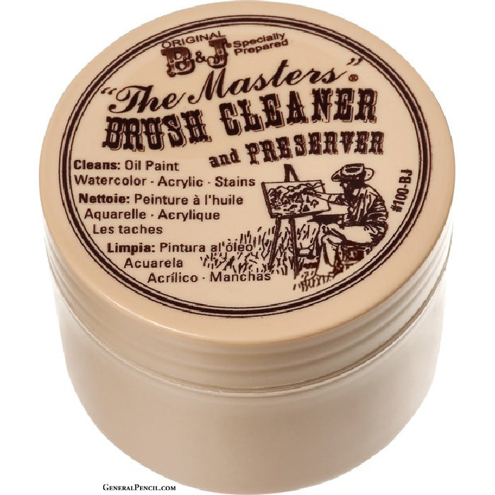 Since 1979 people have relied upon The Original B&J “The Masters”® Brush Cleaner and Preserver to take special care in cleaning and conditioning artist brushes. The formula is non-abrasive, yet effectively removes paints including oil and acrylic, as well as inks, dyes, grass stains, grease, and grime. Just add water to activate the cleaning and preserving formula.