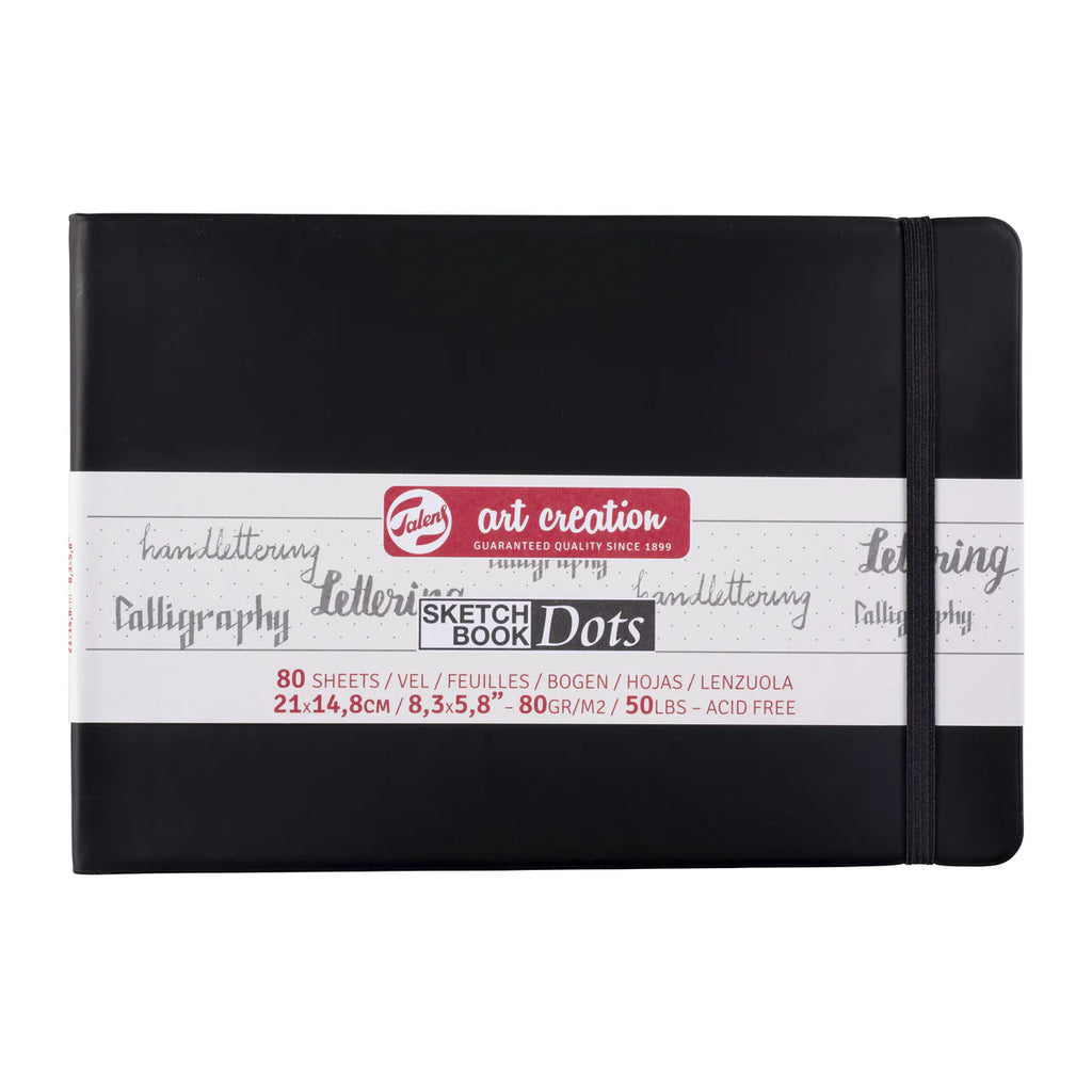 Talens Art Creation dotted sketchbook | s contain 80 cream-coloured, dotted sheets of 80 g/m², feature a soft, stylish black cover and include a ribbon bookmark and elastic closure band.